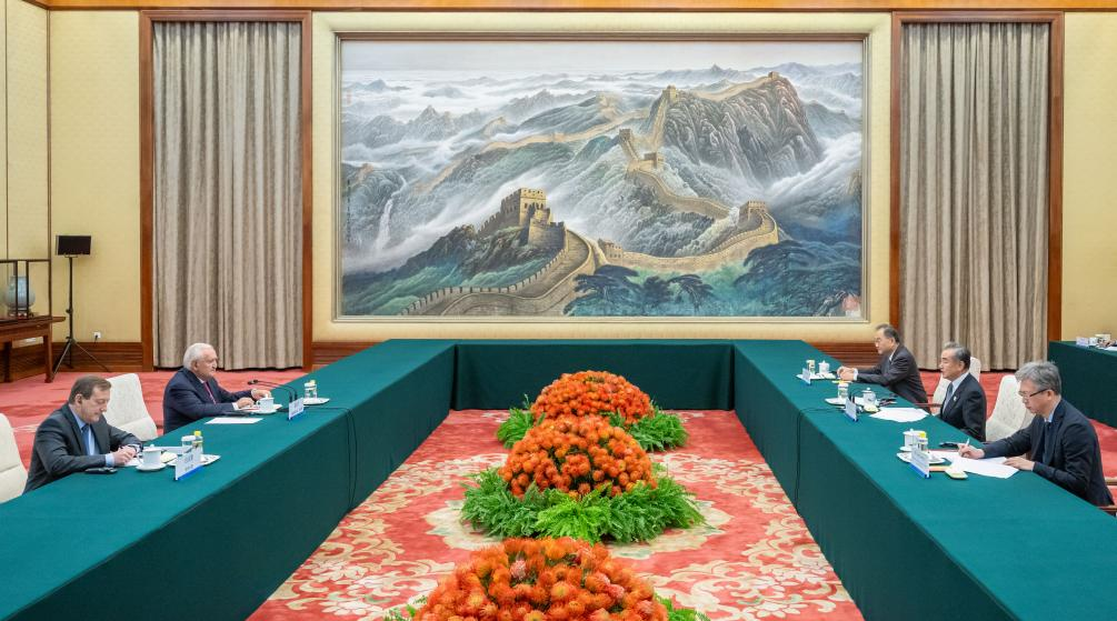 Chinese Foreign Minister Wang Yi, also a member of the Political Bureau of the Communist Party of China Central Committee, meets with Jean-Pierre Raffarin, special representative of French President Emmanuel Macron and former French prime minister, who is in Beijing for the third Belt and Road Forum for International Cooperation, at the Great Hall of the People in Beijing, capital of China, Oct. 19, 2023. (Xinhua/Zhai Jianlan)