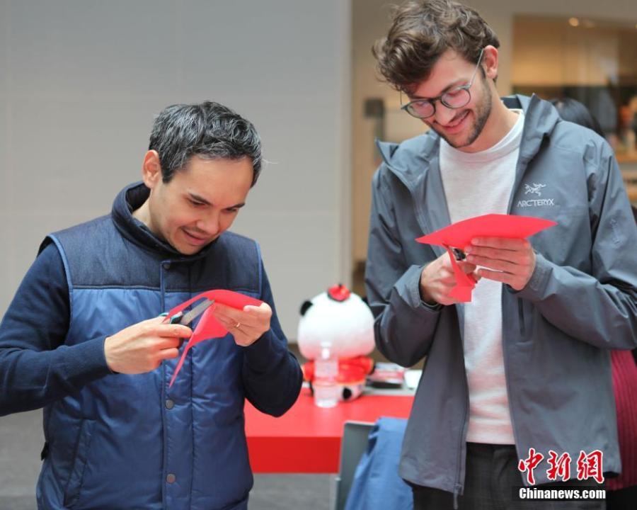 Two men learn paper-cutting during the Confucius Institute Day at the Confucius Institute in Leuven, Belgium, Oct. 19, 2023. (Photo: China News Service/De Yongjian)