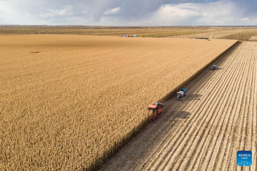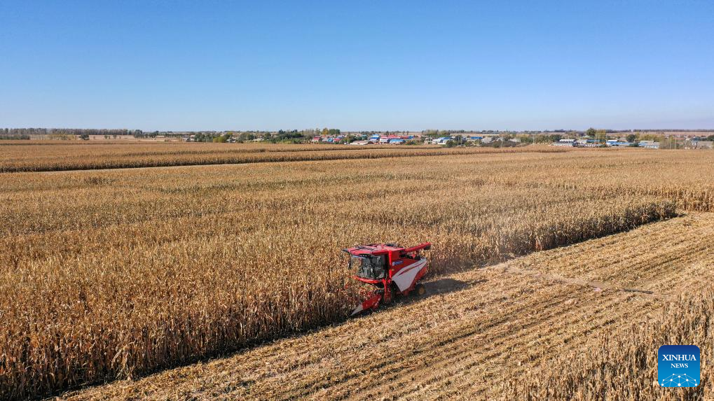 This aerial photo taken on Oct. 19, 2023 shows farmers harvesting corn in Dongsheng Village of Zhaodong City, northeast China's Heilongjiang Province. China's top grain producer Heilongjiang Province is embracing the harvest season of this year while preparing for next year's planting. (Xinhua/Xie Jianfei)