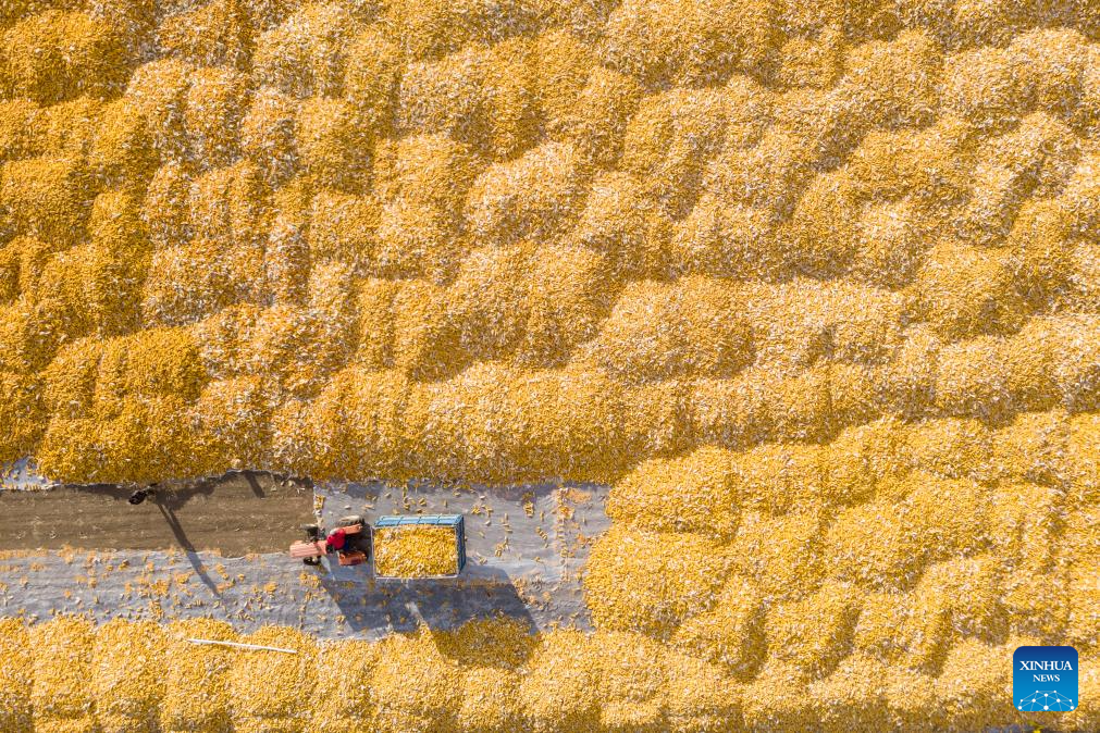 This aerial photo taken on Oct. 19, 2023 shows farmers transferring harvested corn in Gongzhuling, northeast China's Jilin Province. China's Jilin Province is embracing the harvest season of this year. (Xinhua/Zhang Nan)