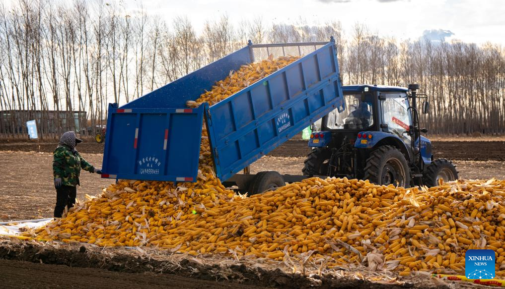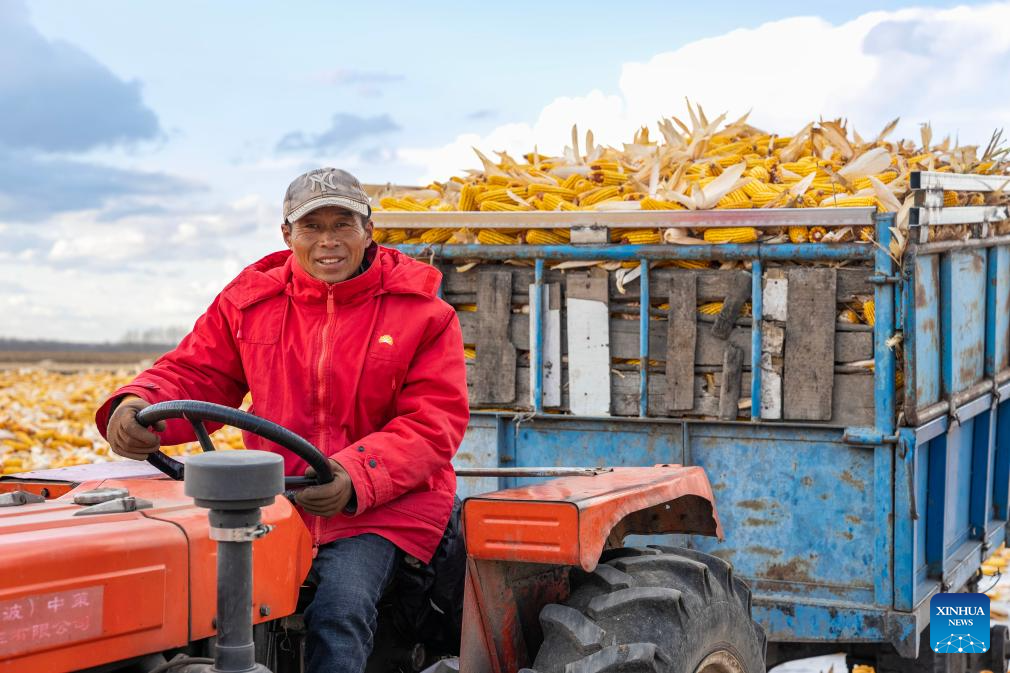 A farmer delivers newly harvested corn in Dongsheng Village of Zhaodong City, northeast China's Heilongjiang Province, Oct. 19, 2023. China's top grain producer Heilongjiang Province is embracing the harvest season of this year while preparing for next year's planting. (Xinhua/Xie Jianfei)