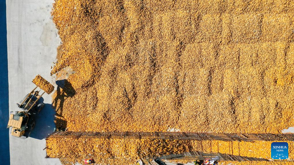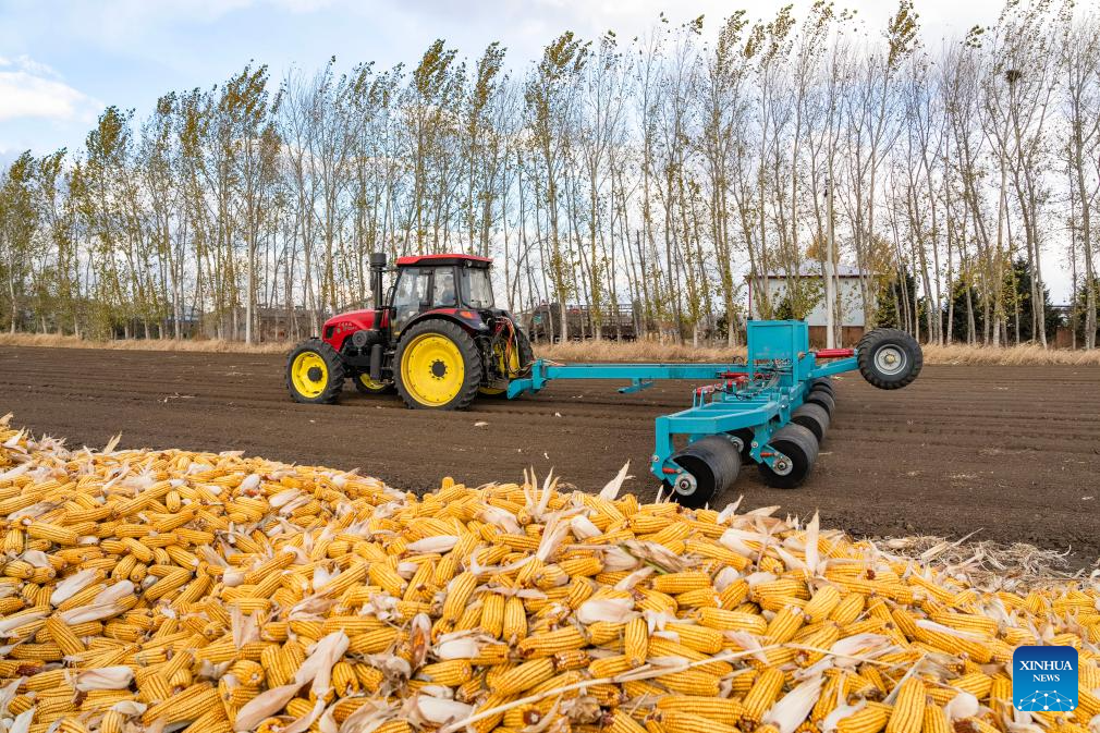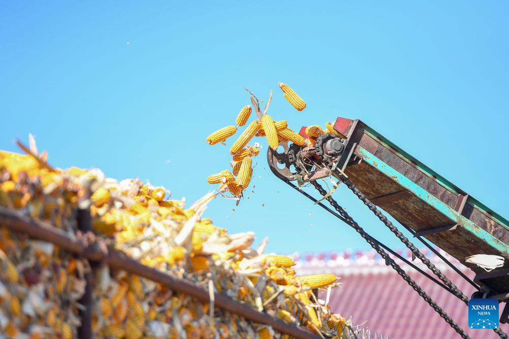 Harvested corn are transferred in Gongzhuling, northeast China's Jilin Province, Oct. 19, 2023. China's Jilin Province is embracing the harvest season of this year. (Xinhua/Zhang Nan)