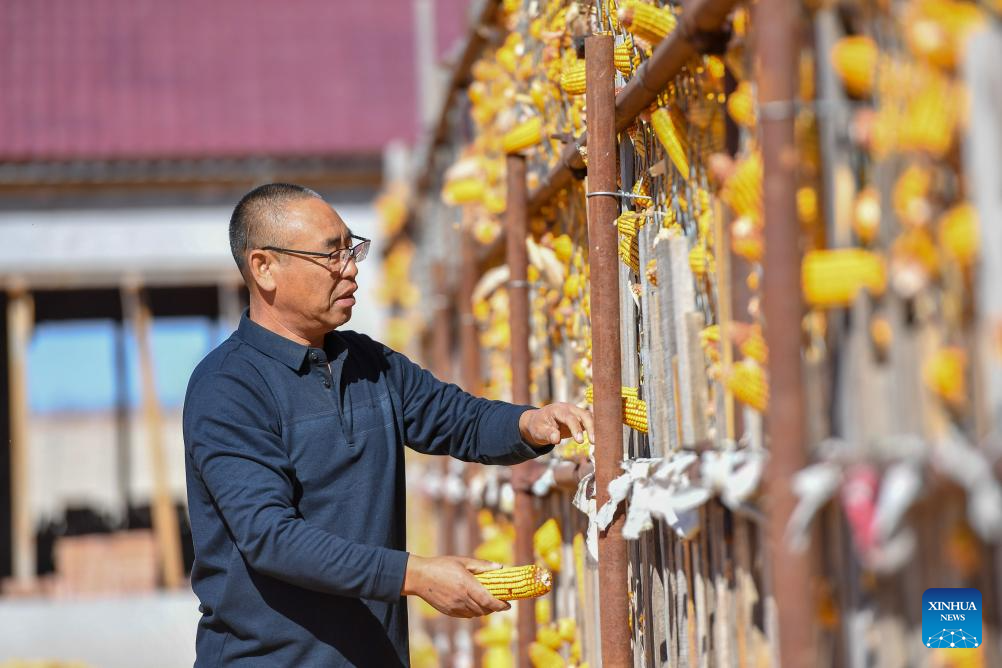 A farmer checks corn storage in Gongzhuling, northeast China's Jilin Province, Oct. 19, 2023. China's Jilin Province is embracing the harvest season of this year. (Xinhua/Zhang Nan)