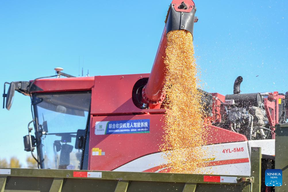 A driverless agricultural machine harvests corn at a farm in Gongzhuling, northeast China's Jilin Province, Oct. 19, 2023. China's Jilin Province is embracing the harvest season of this year. (Xinhua/Zhang Nan)
