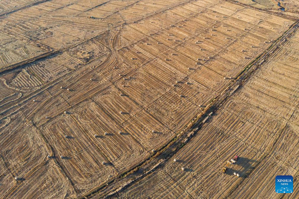 This aerial photo taken on Oct. 18, 2023 shows a farming machine delivering packed straw in Shangzhi City, northeast China's Heilongjiang Province. China's top grain producer Heilongjiang Province is embracing the harvest season of this year while preparing for next year's planting. (Xinhua/Xie Jianfei)