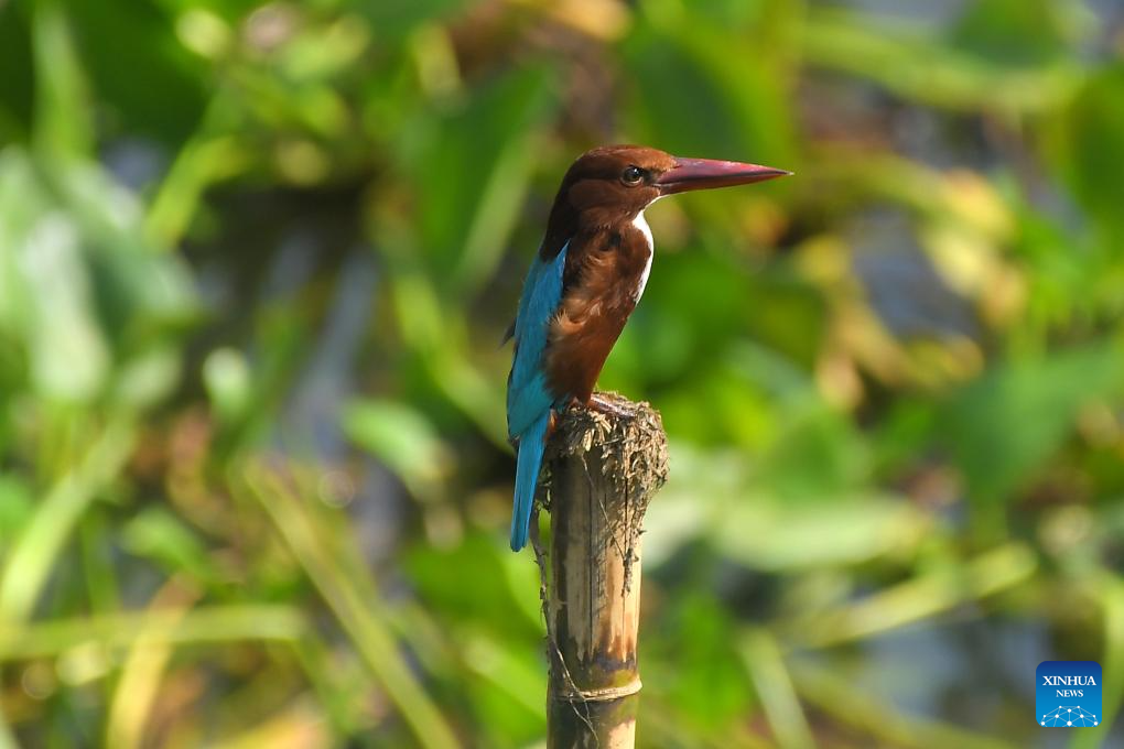 A kingfisher is pictured at the Pobitora Wildlife Sanctuary in Morigaon district of India's northeastern state of Assam, Oct. 20, 2023. Pobitora reopened for the tourist season after monsoon floods. (Str/Xinhua)