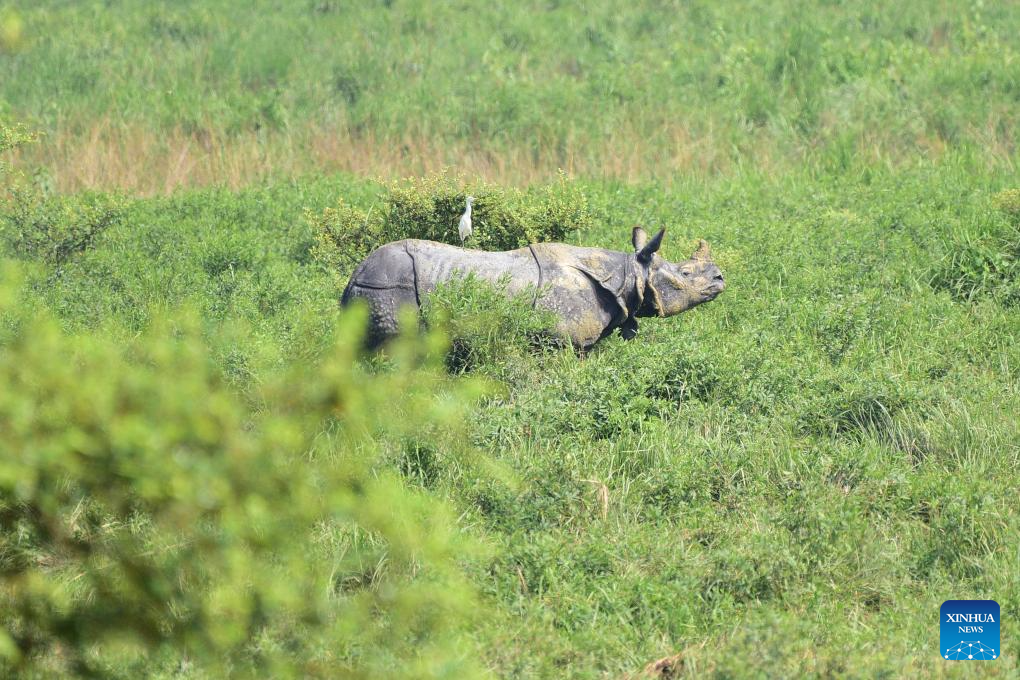An Indian one-horned rhino walks inside the Pobitora Wildlife Sanctuary in Morigaon district of India's northeastern state of Assam, Oct. 20, 2023. Pobitora reopened for the tourist season after monsoon floods. (Str/Xinhua)