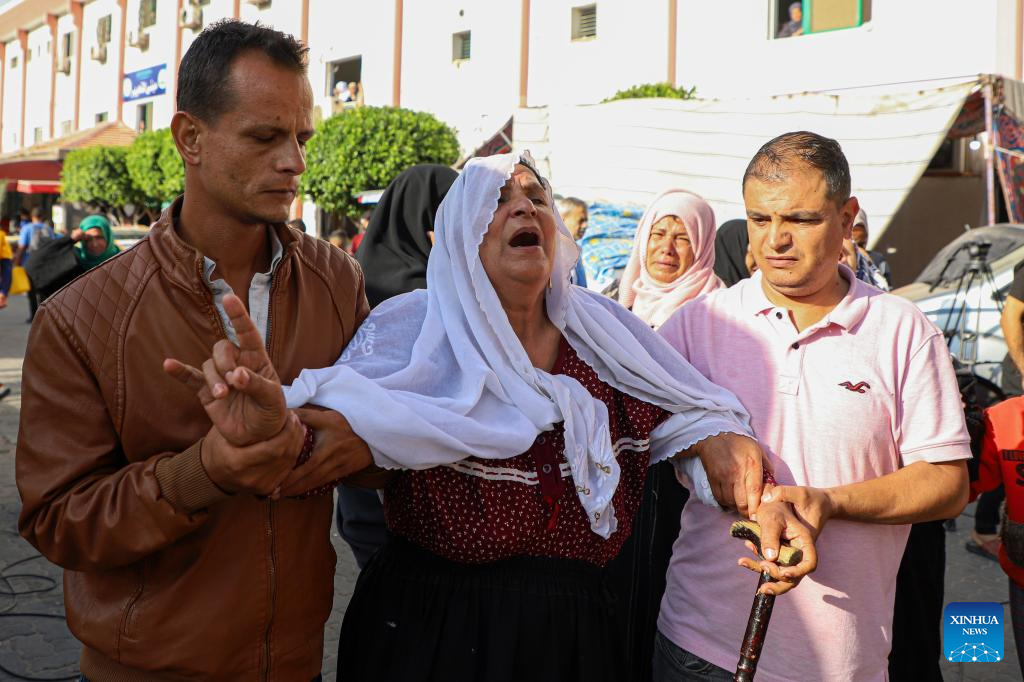 People mourn the death of their relatives at a hospital in the southern Gaza Strip, Oct. 20, 2023. The number of Palestinian fatalities has exceeded 3,785, with over 13,000 individuals sustaining injuries since Oct. 7, said the health ministry in Gaza on Thursday. (Photo by Rizek Abdeljawad/Xinhua)