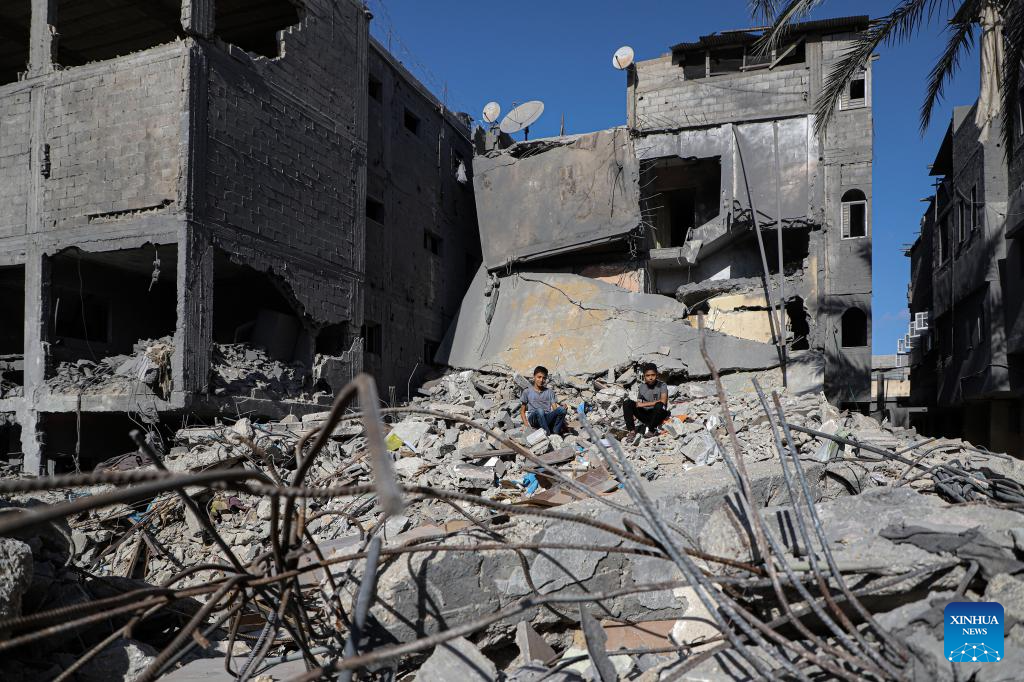 People stand on ruins of dwellings destroyed in Israeli airstrikes in the southern Gaza Strip city of Khan Younis, Oct. 20, 2023. The number of Palestinian fatalities has exceeded 3,785, with over 13,000 individuals sustaining injuries since Oct. 7, said the health ministry in Gaza on Thursday. (Photo by Rizek Abdeljawad/Xinhua)