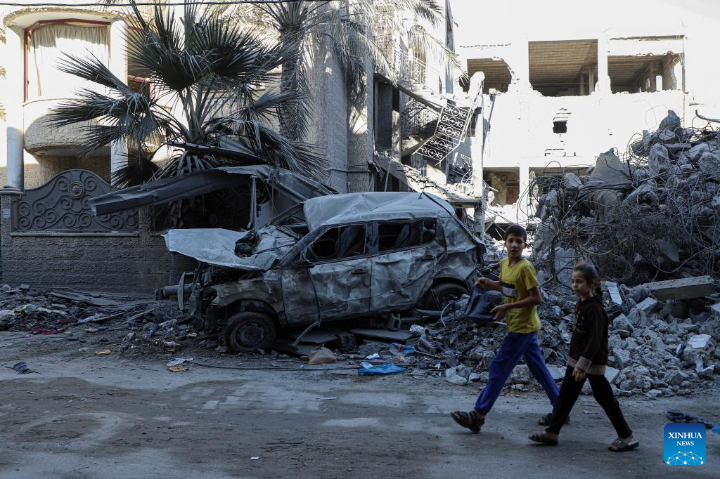 People are seen at a building destroyed in Israeli airstrikes in the southern Gaza Strip city of Khan Younis, Oct. 20, 2023. The number of Palestinian fatalities has exceeded 3,785, with over 13,000 individuals sustaining injuries since Oct. 7, said the health ministry in Gaza on Thursday. (Photo by Rizek Abdeljawad/Xinhua)