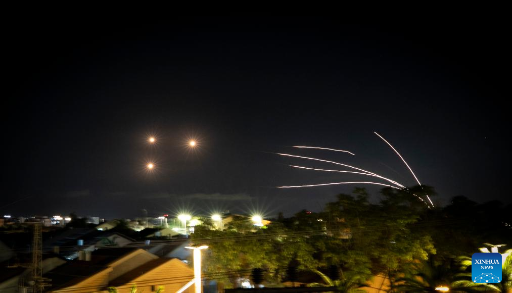 Israel's Iron Dome anti-missile system intercepts rockets launched from the Gaza Strip, as seen from Netivot, southern Israel, Oct. 20, 2023. (Xinhua/Chen Junqing)