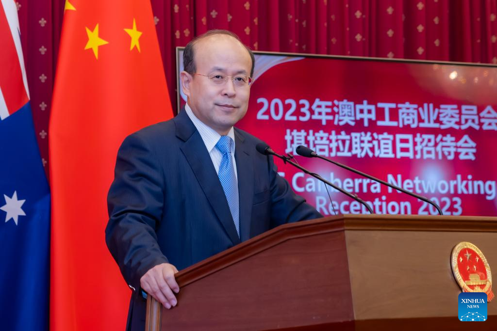 Chinese Ambassador to Australia Xiao Qian delivers a speech on the occasion of the Canberra Networking Day 2023 and the 50th anniversary of the founding of Australia China Business Council (ACBC) in Canberra, Australia, Oct. 18, 2023. Xiao said the development of China-Australia economic and trade cooperation would not only benefit the two countries and two peoples, but also benefit the region and the world. (Photo by Chu Chen/Xinhua)