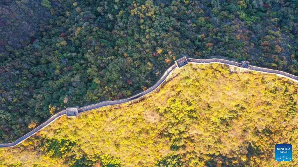 This aerial photo taken on Oct. 21, 2023 shows the autumn scenery of the Mutianyu section of the Great Wall in Beijing, capital of China. (Xinhua/Chen Yehua)