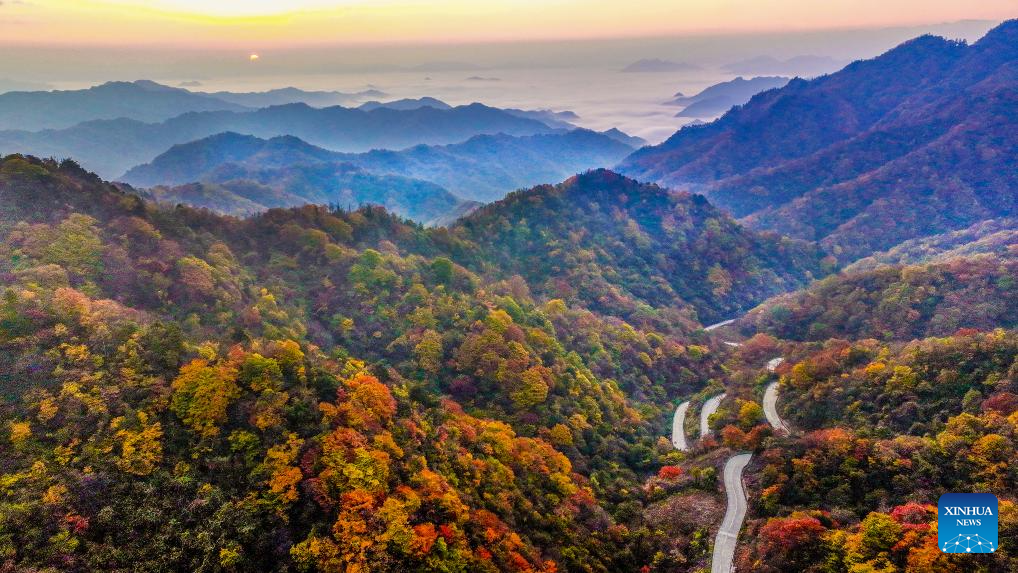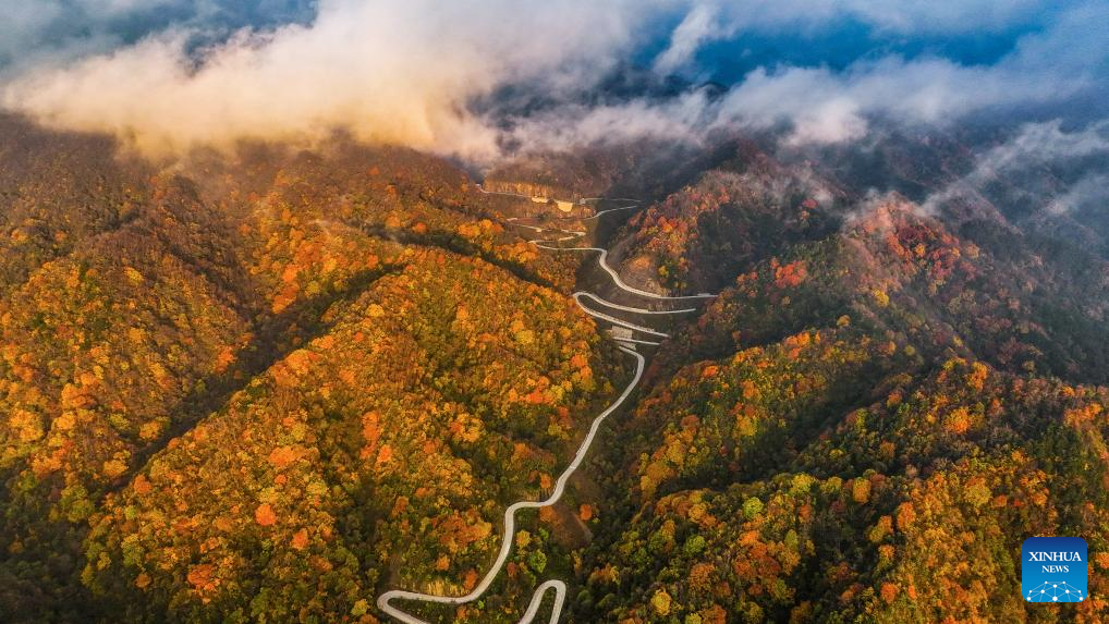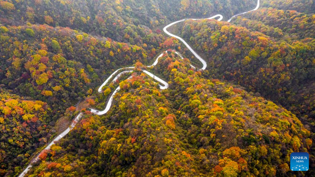 This aerial photo taken on Oct. 22, 2023 shows a scenic road in Liuba County of Hanzhong, northwest China's Shaanxi Province. (Photo by Zhang Lan/Xinhua)