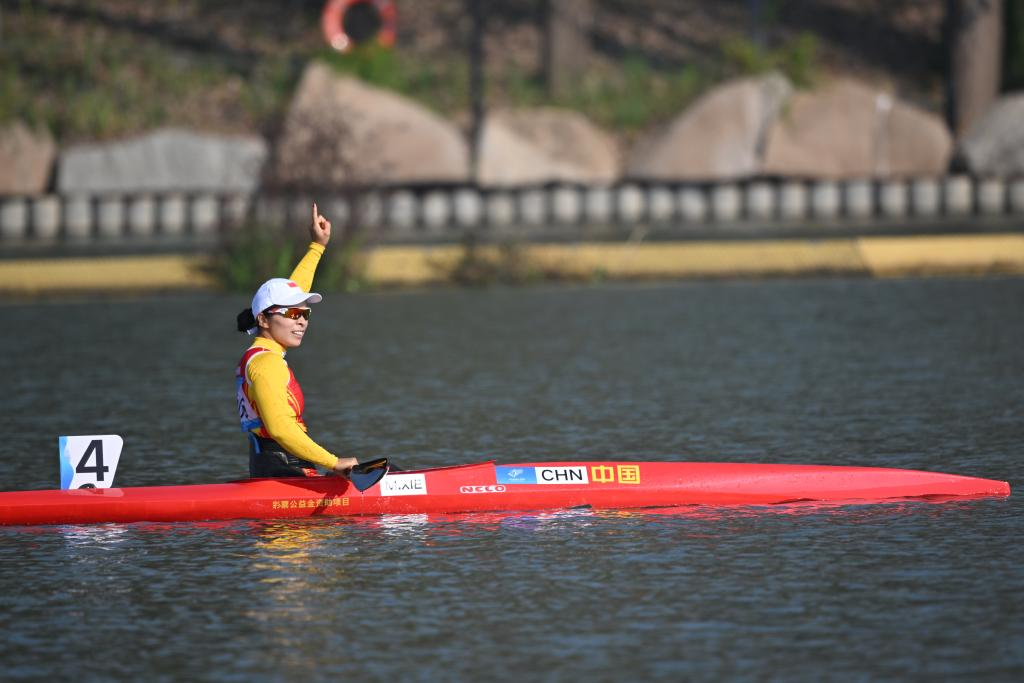 Xie Maosan of China celebrates after the Women's KL1 Final of Canoe during the 4th Asian Para Games in Hangzhou, east China's Zhejiang Province, Oct. 23, 2023. (Xinhua/Cai Yang)