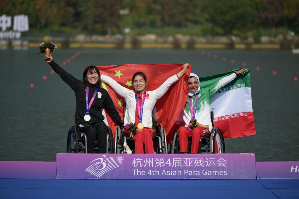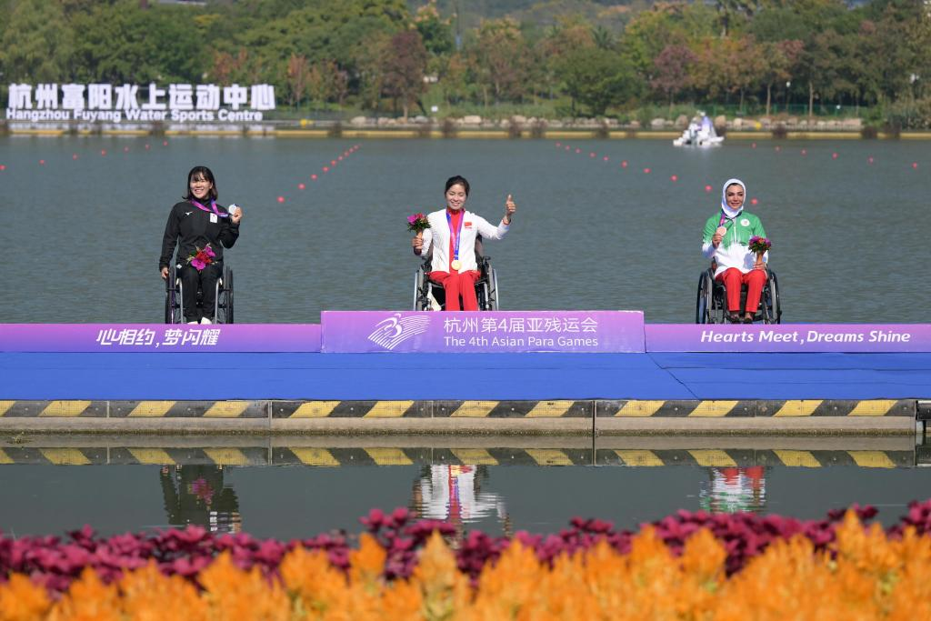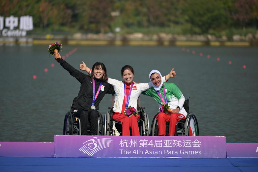 Gold medalist Xie Maosan (C) of China, silver medalist Seryu Monika (L) of Japan and bronze medalist Sara Abdolmaleki of Iran attend the awarding ceremony for the Women's KL1 of Canoe during the 4th Asian Para Games in Hangzhou, east China's Zhejiang Province, Oct. 23, 2023. (Xinhua/Li He)