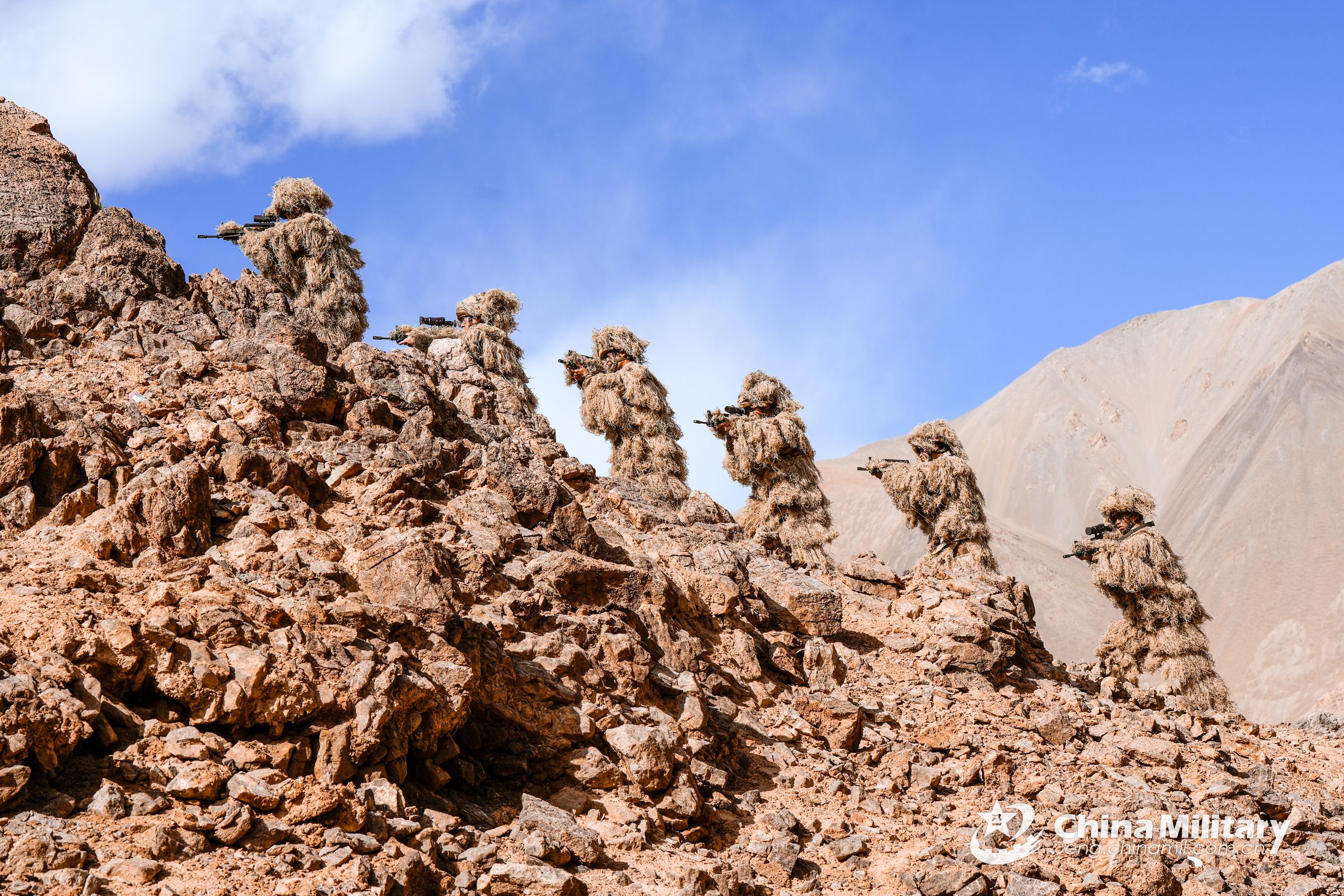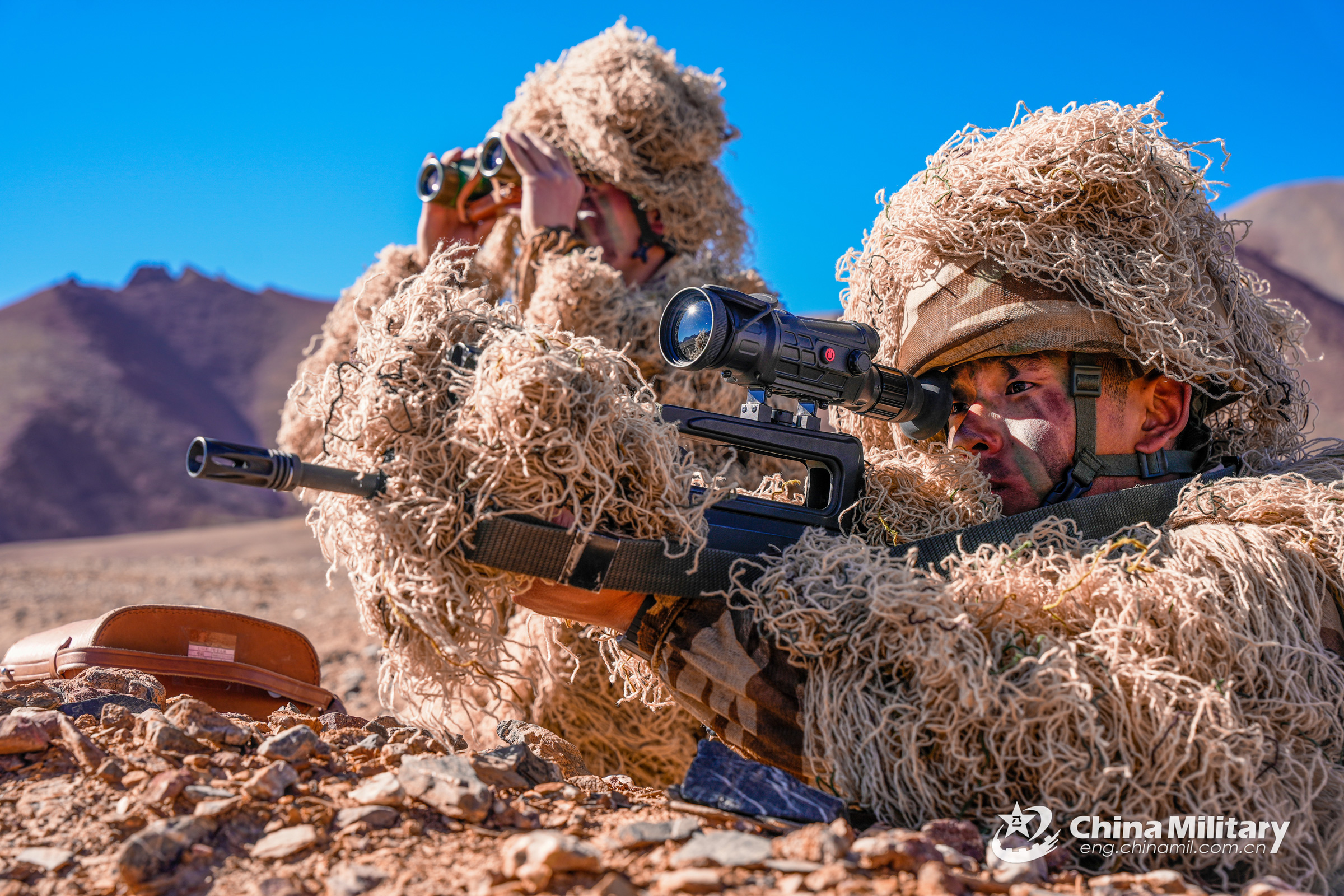 Scouts assigned to a reconnaissance element of an army regiment work together to sight in target during a tactical training exercise in mid-September, 2023. (eng.chinamil.com.cn/Photo by Meng Guoqiang)