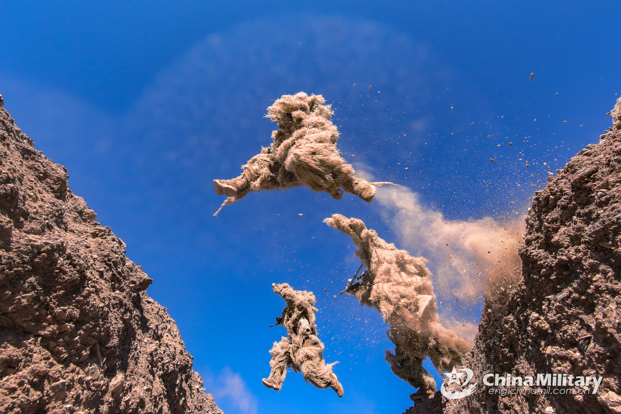 Scouts assigned to reconnaissance element of an army regiment stride over an obstacle in ghillie suits during a tactical training exercise in mid-September, 2023. (eng.chinamil.com.cn/Photo by Meng Guoqiang)