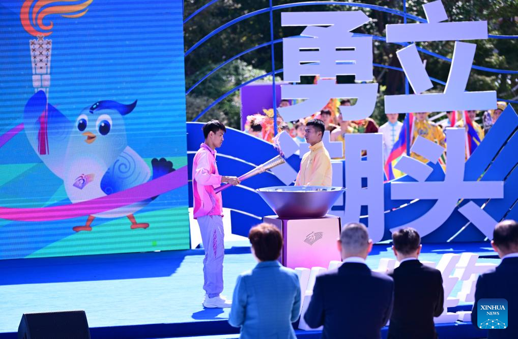 Photo shows the flame retrieval ceremony of the torch relay of the 4th Asian Para Games in Hangzhou, east China's Zhejiang Province, Oct. 21, 2023 (Photo by Weng Xinyang/Xinhua)