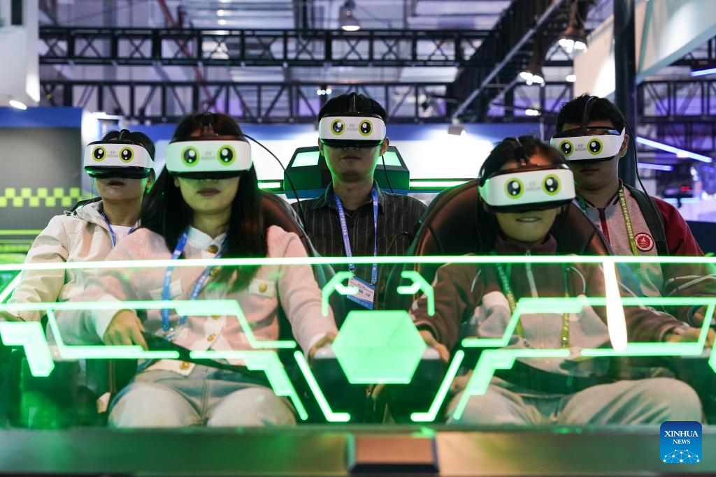People try VR devices during the 11th China (Wuhu) Popularized Science Products Exposition in Wuhu, east China's Anhui Province, Oct. 21, 2023. The expo kicked off here on Saturday. (Xinhua/Du Yu)