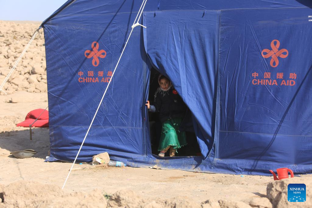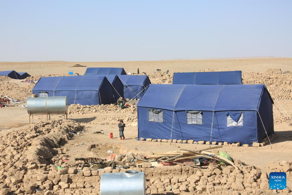 This photo taken on Oct. 16, 2023 shows China-donated tents in Herat Province, Afghanistan. West Afghanistan's Herat province has experienced its ever-destructive earthquakes in recent decades as several tremors, some measuring a magnitude 6.3, caused thousands of casualties. The Chinese government has pledged emergency humanitarian assistance to Afghanistan to help the country with earthquake relief work.(Photo by Saifurahman Safi/Xinhua)