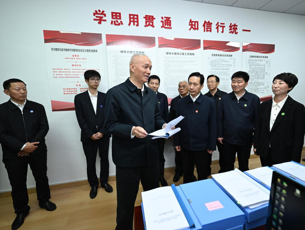Cai Qi, a member of the Standing Committee of the Political Bureau of the Communist Party of China (CPC) Central Committee and a member of the Secretariat of the CPC Central Committee, inspects the office for the ongoing Party-wide education campaign of Ningshan County Party committee in Ningshan County, northwest China's Shaanxi Province, Oct. 21, 2023. Cai made an inspection tour in Ningshan County on Saturday and Sunday. (Xinhua/Xie Huanchi)