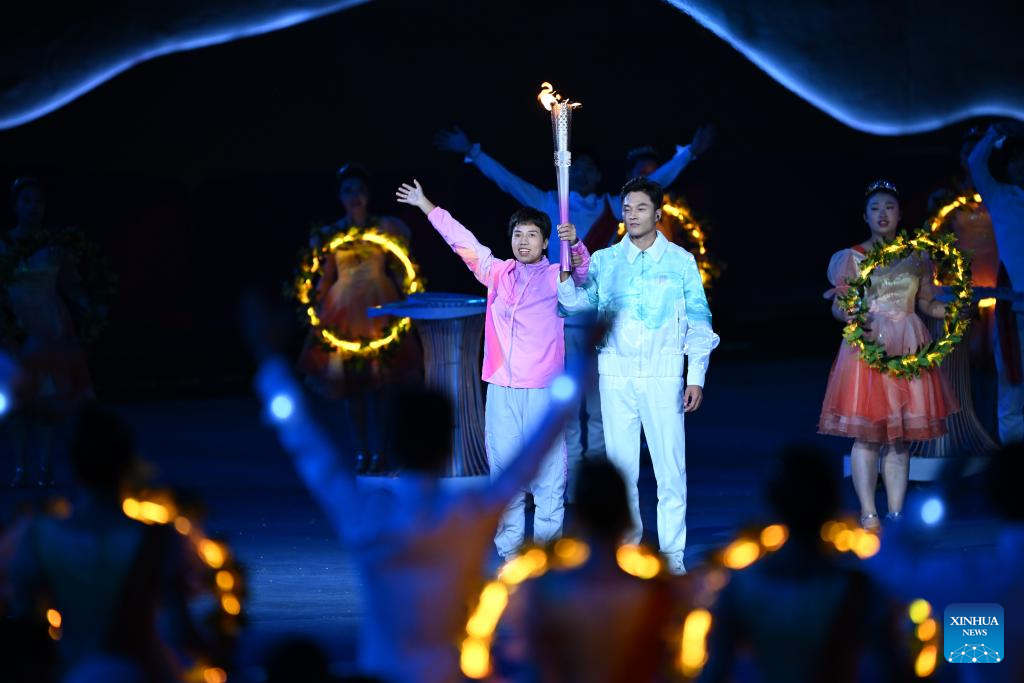 Torch bearer Zheng Xiongying (R) and Hou Bin pass the torch during the opening ceremony of the 4th Asian Para Games in Hangzhou of east China's Zhejiang Province, on Oct. 22, 2023. (Xinhua/Jia Haocheng)