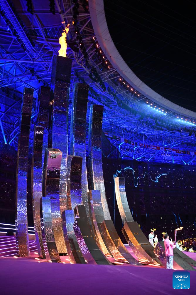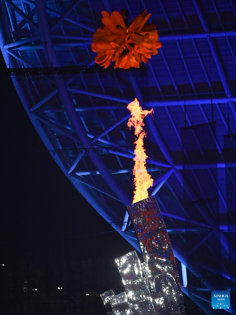 The cauldron is lit during the opening ceremony of the 4th Asian Para Games in Hangzhou of east China's Zhejiang Province, on Oct. 22, 2023. (Xinhua/Han Chuanhao)
