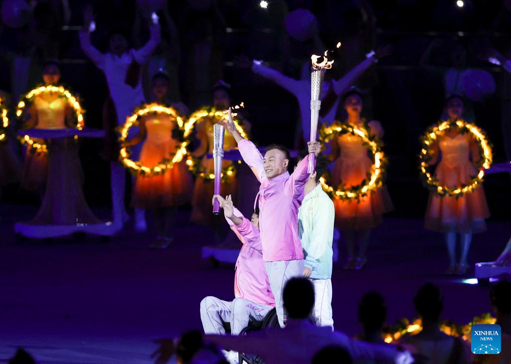 Torch bearer Zhou Guohua (C) relays the torch during the opening ceremony of the 4th Asian Para Games in Hangzhou of east China's Zhejiang Province, on Oct. 22, 2023. (Xinhua/Hu Xingyu)