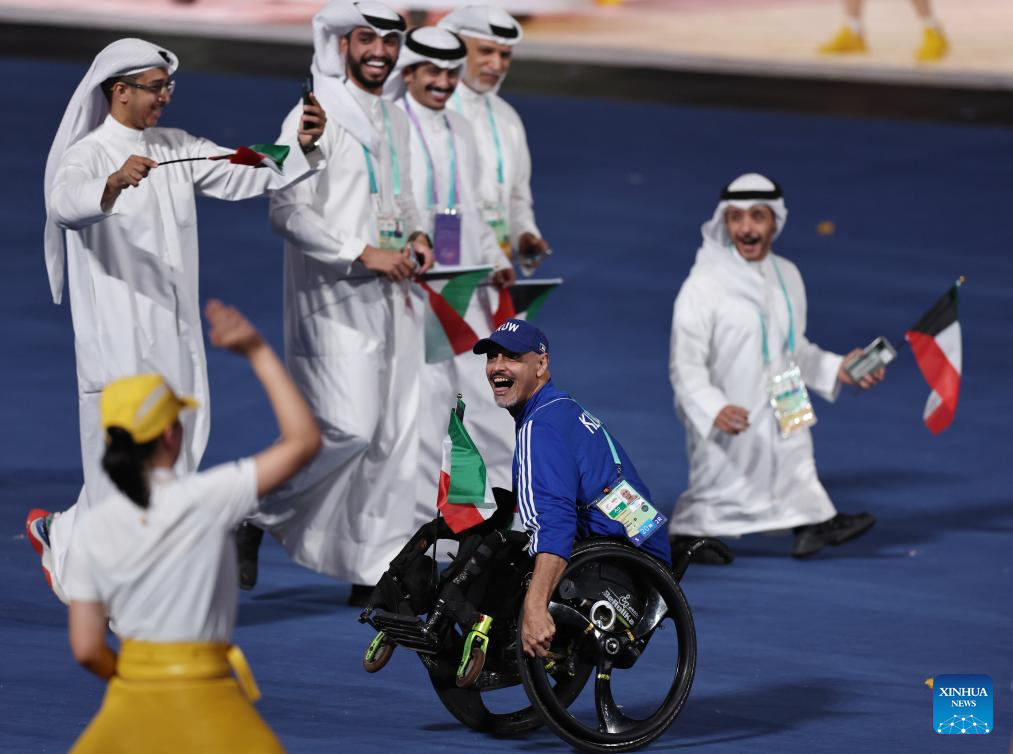 A member of delegation of Kuwait reacts during the opening ceremony of the 4th Asian Para Games in Hangzhou of east China's Zhejiang Province, on Oct. 22, 2023. (Xinhua/Jia Haocheng)