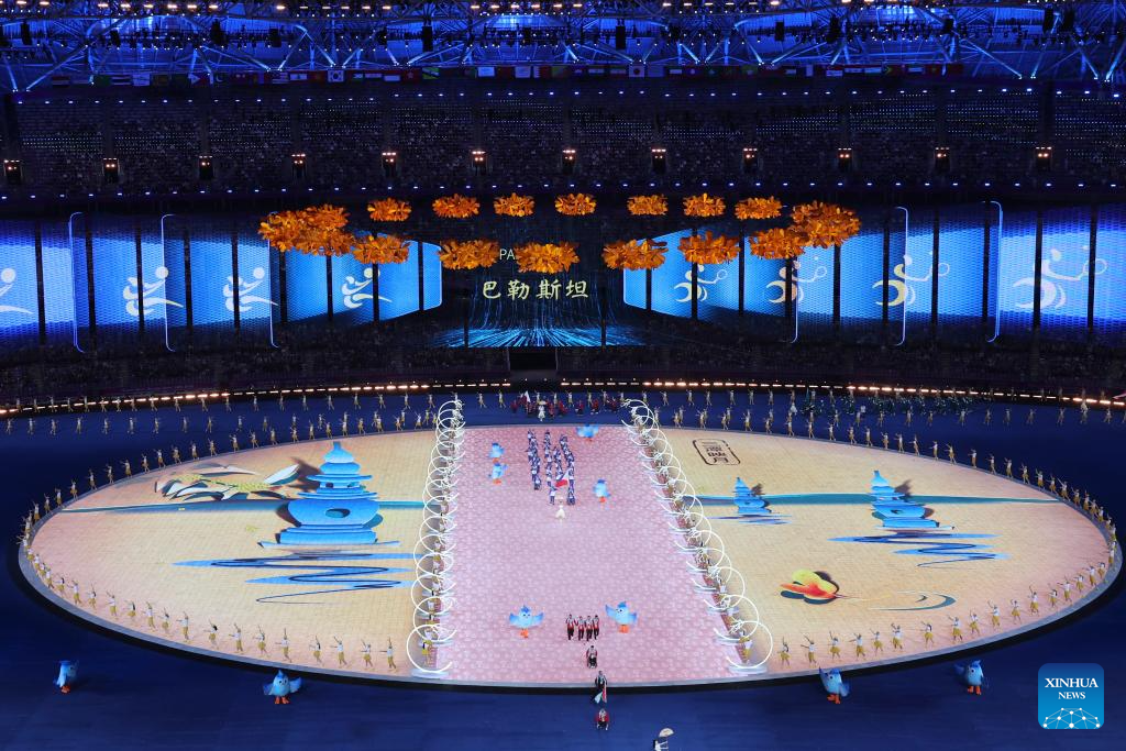 Delegation of Palestine parade into the Hangzhou Olympic Sports Center Stadium during the opening ceremony of the 4th Asian Para Games in Hangzhou of east China's Zhejiang Province, on Oct. 22, 2023. (Xinhua/Huang Zongzhi)
