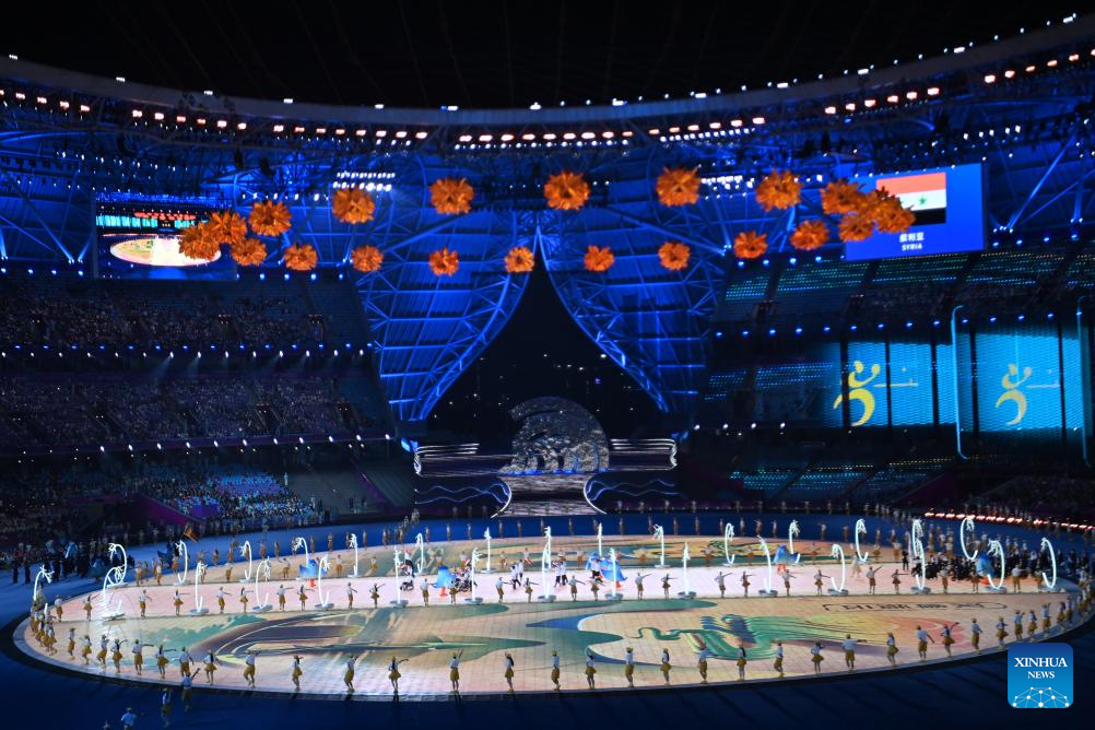 Delegation of Syria parade into the Hangzhou Olympic Sports Center Stadium during the opening ceremony of the 4th Asian Para Games in Hangzhou of east China's Zhejiang Province, on Oct. 22, 2023. (Xinhua/Huang Zongzhi)