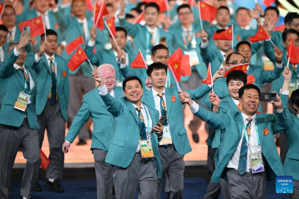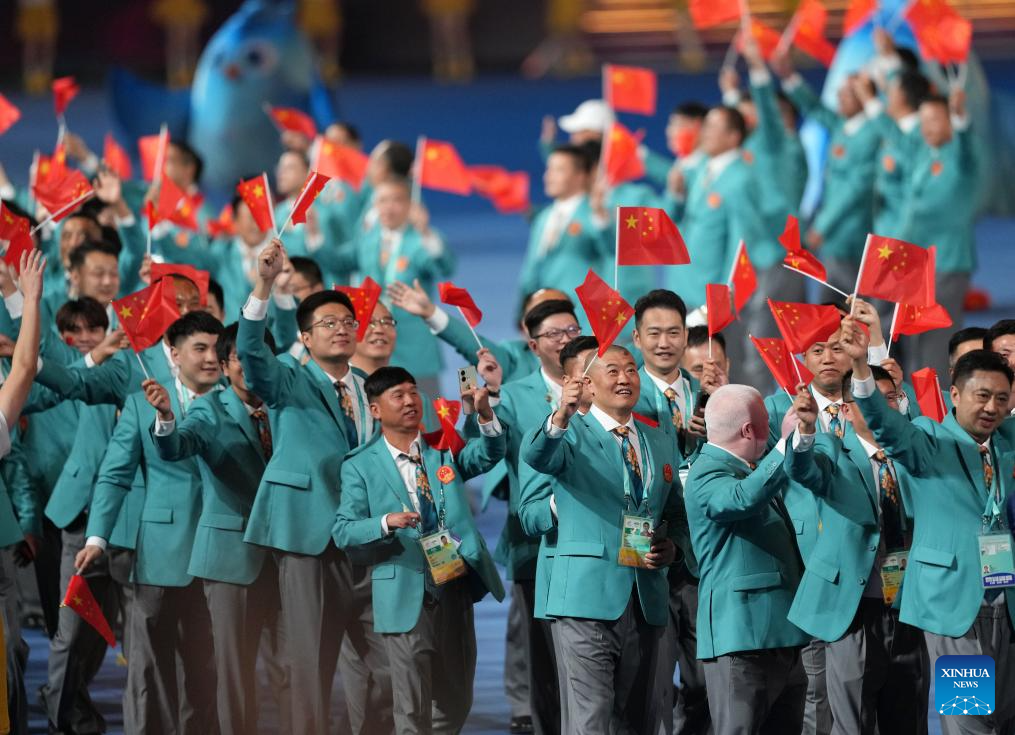 Delegation of China parade into the Hangzhou Olympic Sports Center Stadium during the opening ceremony of the 4th Asian Para Games in Hangzhou of east China's Zhejiang Province, on Oct. 22, 2023. (Xinhua/Han Chuanhao)