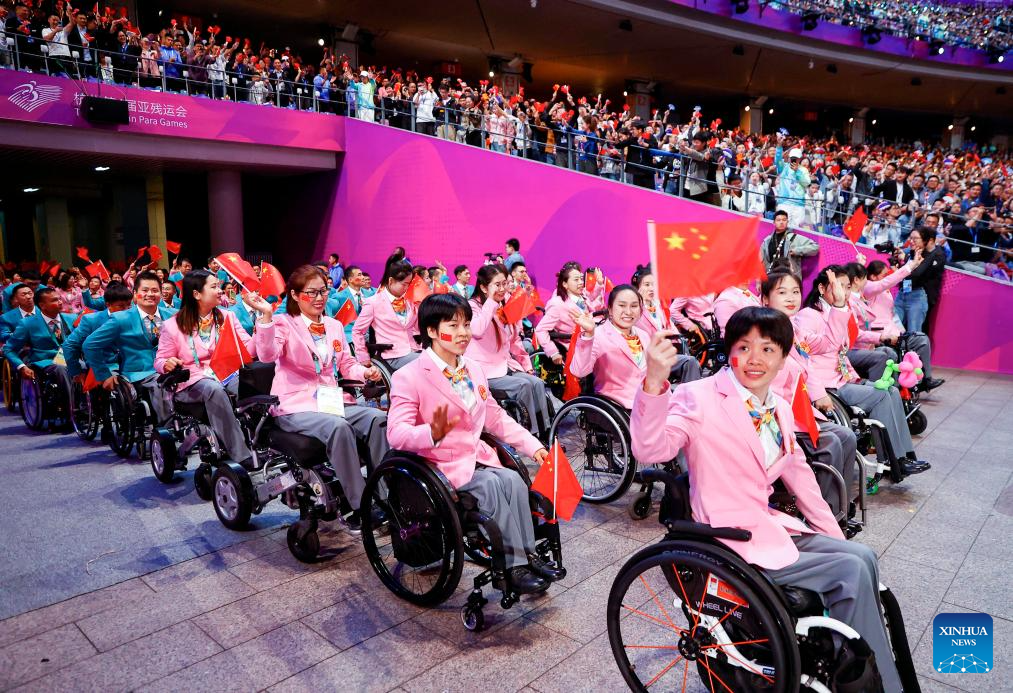 Delegation of China parade into the Hangzhou Olympic Sports Center Stadium during the opening ceremony of the 4th Asian Para Games in Hangzhou of east China's Zhejiang Province, on Oct. 22, 2023. (Xinhua/Bei He)