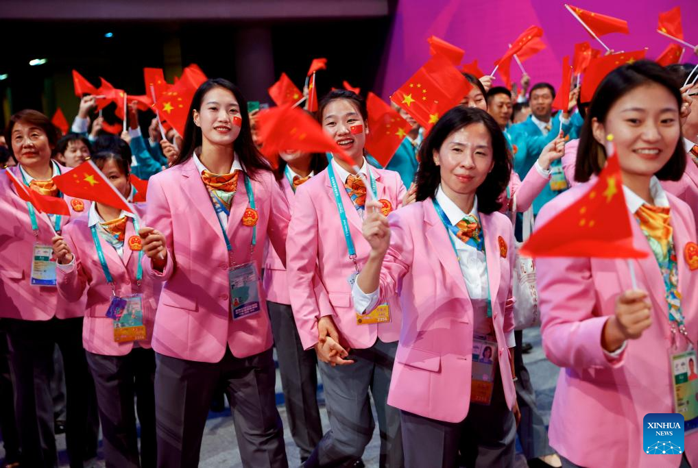 Delegation of China parade into the Hangzhou Olympic Sports Center Stadium during the opening ceremony of the 4th Asian Para Games in Hangzhou of east China's Zhejiang Province, on Oct. 22, 2023. (Xinhua/Cai Yang)