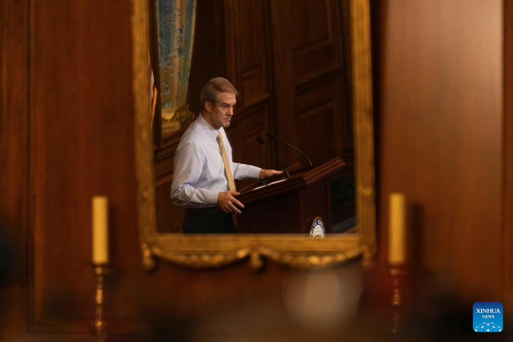 US right-wing Republican Jim Jordan, chairman of the US House Judiciary Committee, is reflected in a mirror as he attends a press conference in Washington, DC, on Oct 20, 2023. Jordan lost the third vote in his bid for the US House speaker on Friday. [Photo/Xinhua]
