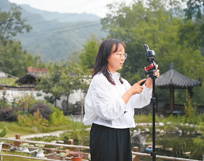 A staff member of a B&B hotel in Datan village, Liuba county, northwest China's Shaanxi Province advertises the hotel at a livestream. (Xinhua/Liu Xiao)