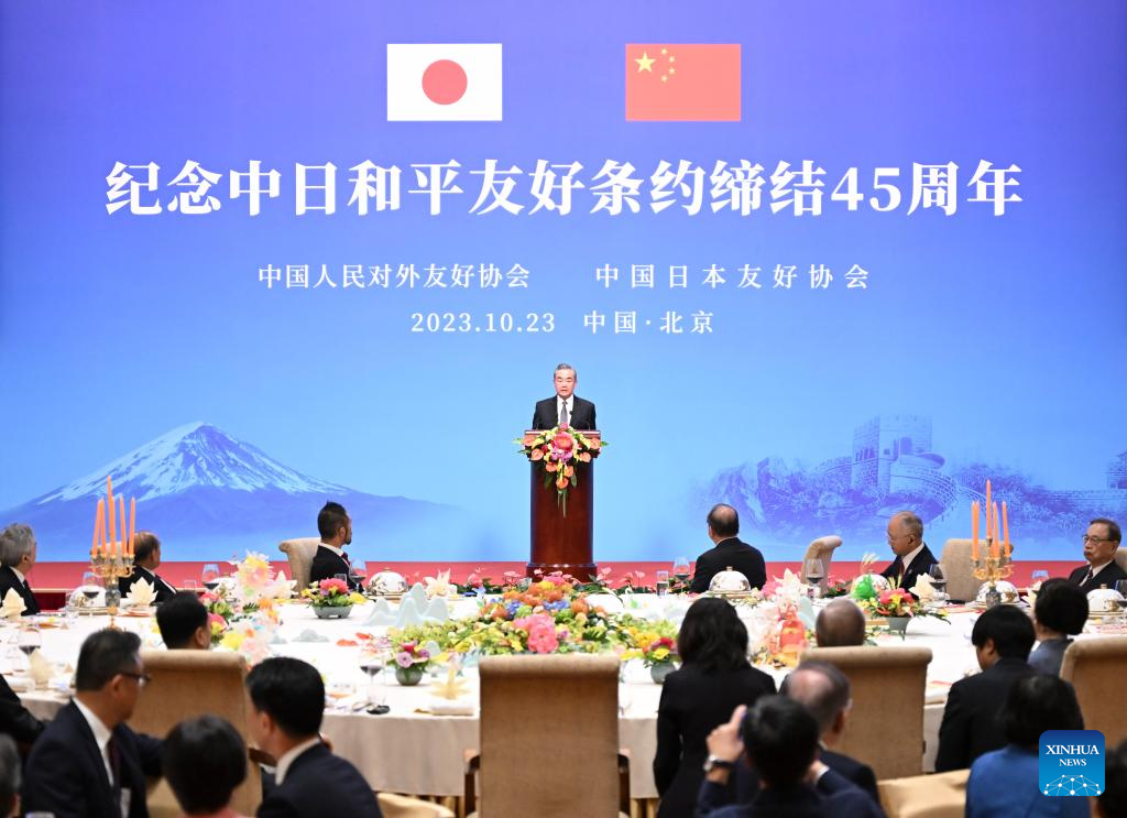 Wang Yi, director of the Office of the Central Commission for Foreign Affairs, also a member of the Political Bureau of the Communist Party of China Central Committee, attends a reception commemorating the 45th anniversary of the signing of the China-Japan Treaty of Peace and Friendship at the Diaoyutai State Guesthouse in Beijing, capital of China, Oct. 23, 2023. (Xinhua/Yan Yan)