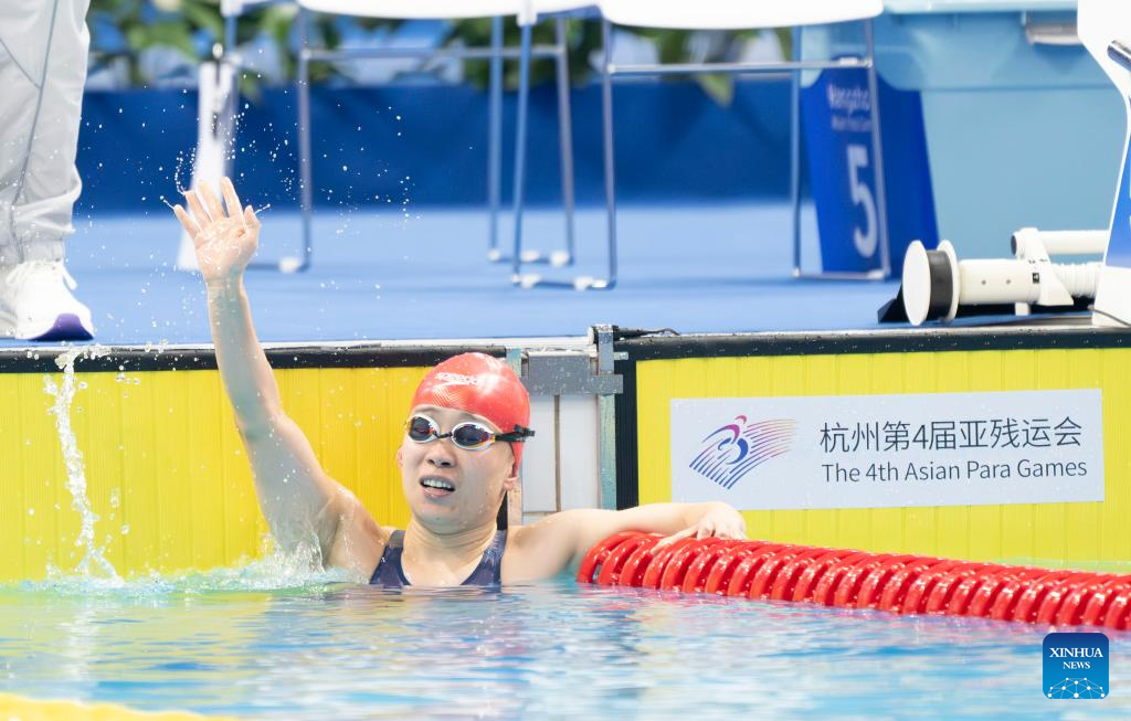 Liu Yu of China celebrates after winning the Women's 200m Freestyle S5 Final at the 4th Asian Para Games in Hangzhou, east China's Zhejiang Province, Oct. 24, 2023. (Xinhua/Cai Yang)