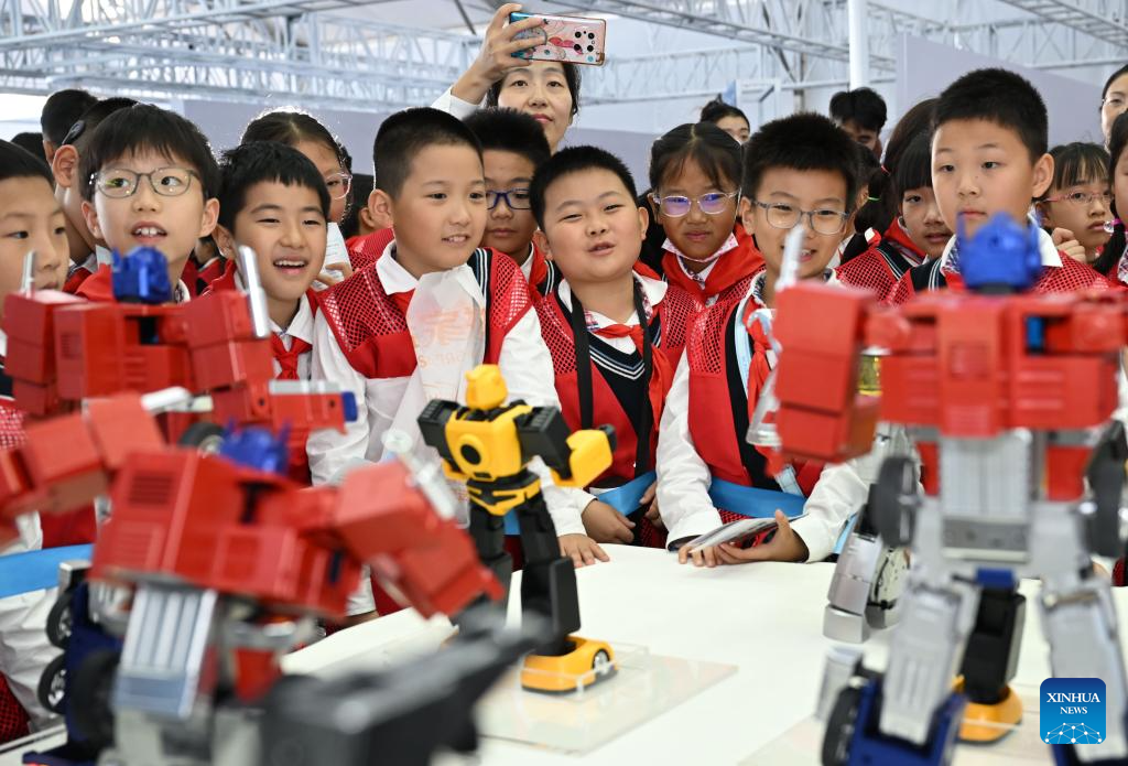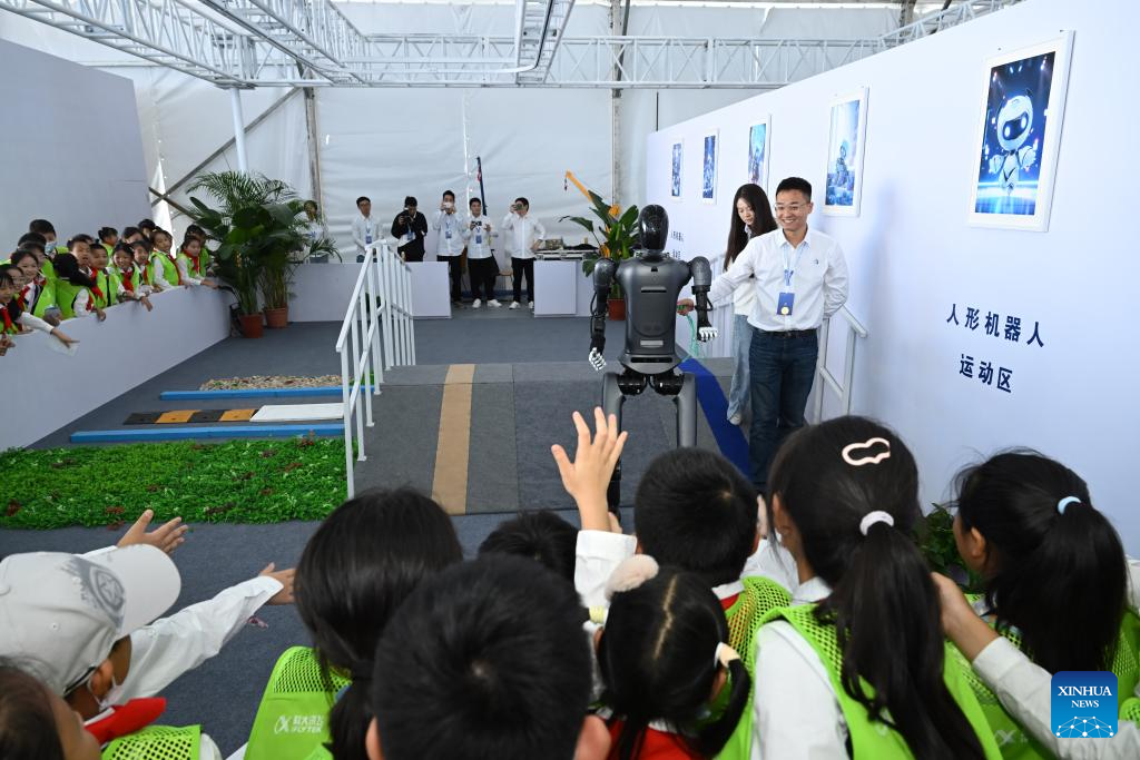 Children attend a study camp during the 6th World Voice Expo in Hefei, east China's Anhui Province, Oct. 24, 2023. The 6th World Voice Expo and the iFlytek 1024 Global Developer Festival kicked off here on Tuesday. The latest achievements and application of AI technology will be on display at the 6-day event. (Xinhua/Zhou Mu)