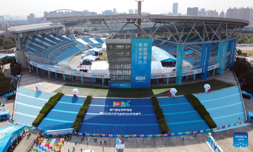 This aerial photo taken on Oct. 24, 2023 shows a scene during the 6th World Voice Expo in Hefei, east China's Anhui Province. The 6th World Voice Expo and the iFlytek 1024 Global Developer Festival kicked off here on Tuesday. The latest achievements and application of AI technology will be on display at the 6-day event. (Xinhua/Zhou Mu)