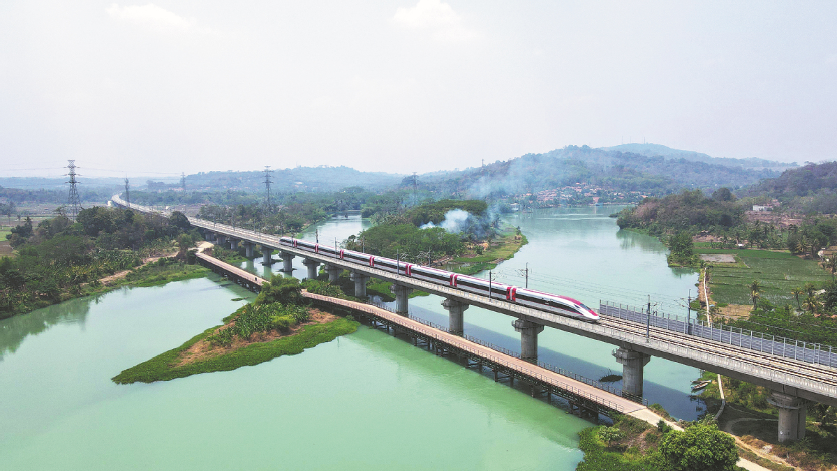 A train operating on the Jakarta-Bandung high-speed line crosses a river in Purwakarta, Indonesia, on Oct 11. The line, which was inaugurated on Oct 2, began commercial operation on Oct 17. XU QIN/XINHUA