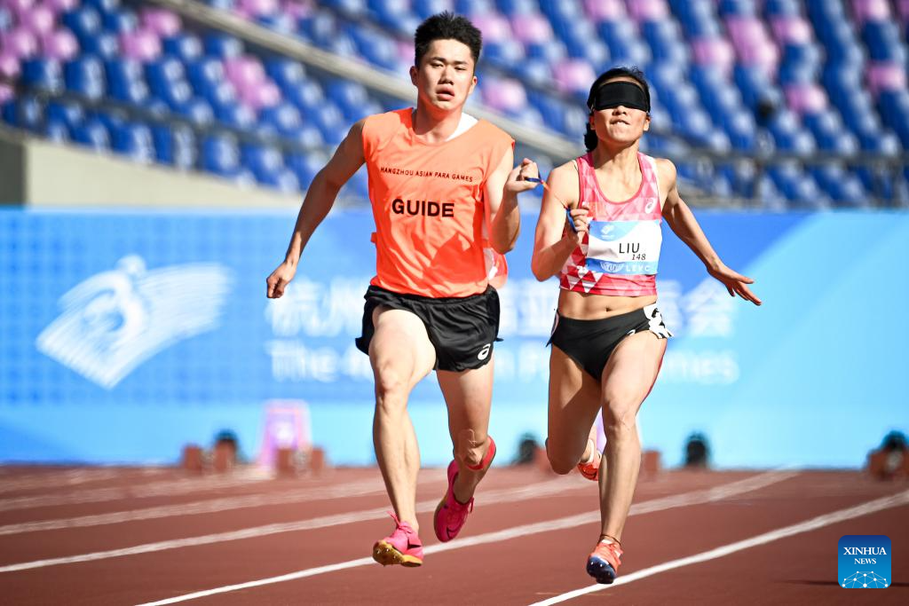 Liu Cuiqing (R) and her guide Chen Shengming of China compete during the Women's 100m T11 Final of Athletics at the 4th Asian Para Games in Hangzhou, east China's Zhejiang Province, Oct. 24, 2023. (Xinhua/Jiang Han)
