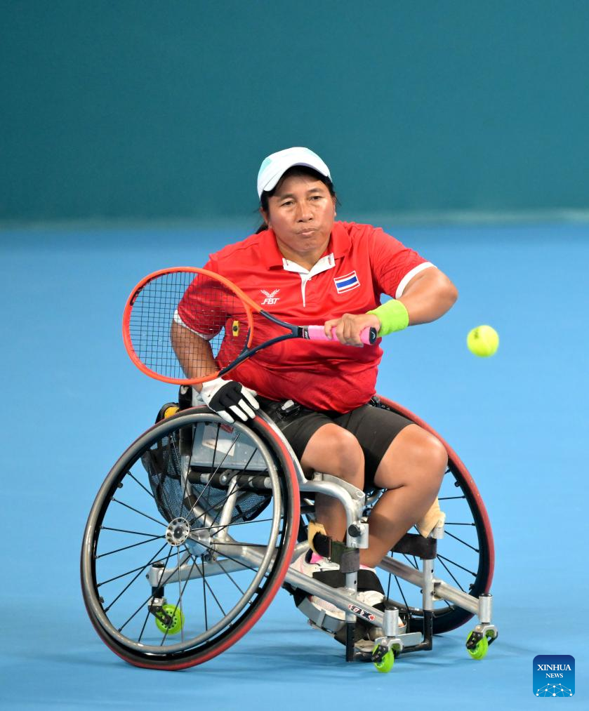 Thailand's Sakhon Khanthasit hits a return during the Women's Doubles Semifinal of Wheelchair Tennis between Thailand's Sakhon Khanthasit/Thipaksorn Singkeaw and China's Guo Luoyao/Zhu Zhenzhen at the 4th Asian Para Games in Hangzhou, east China's Zhejiang Province, Oct. 24, 2023. (Xinhua/Cai Yang)