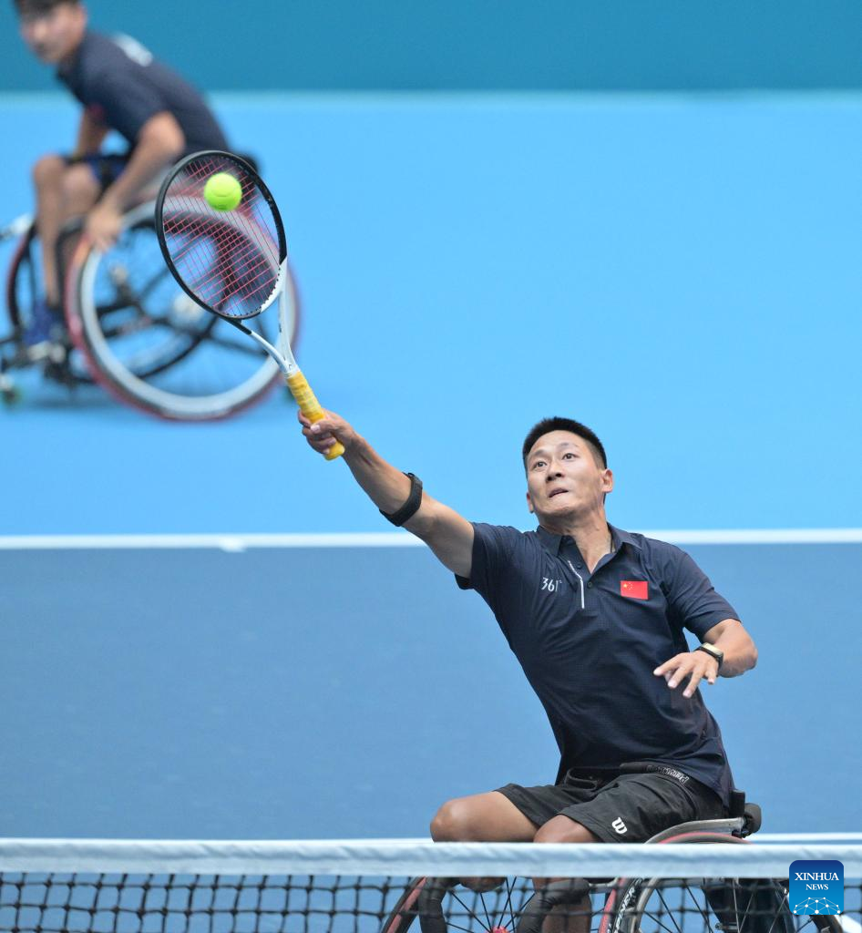 China's Dong Shunjiang(front)/Ji Zhenxu compete during the Men's Doubles Quarterfinal of Wheelchair Tennis against South Korea's Im Howon/Han Sungbong at the 4th Asian Para Games in Hangzhou, east China's Zhejiang Province, Oct. 24, 2023. (Xinhua/Cai Yang)