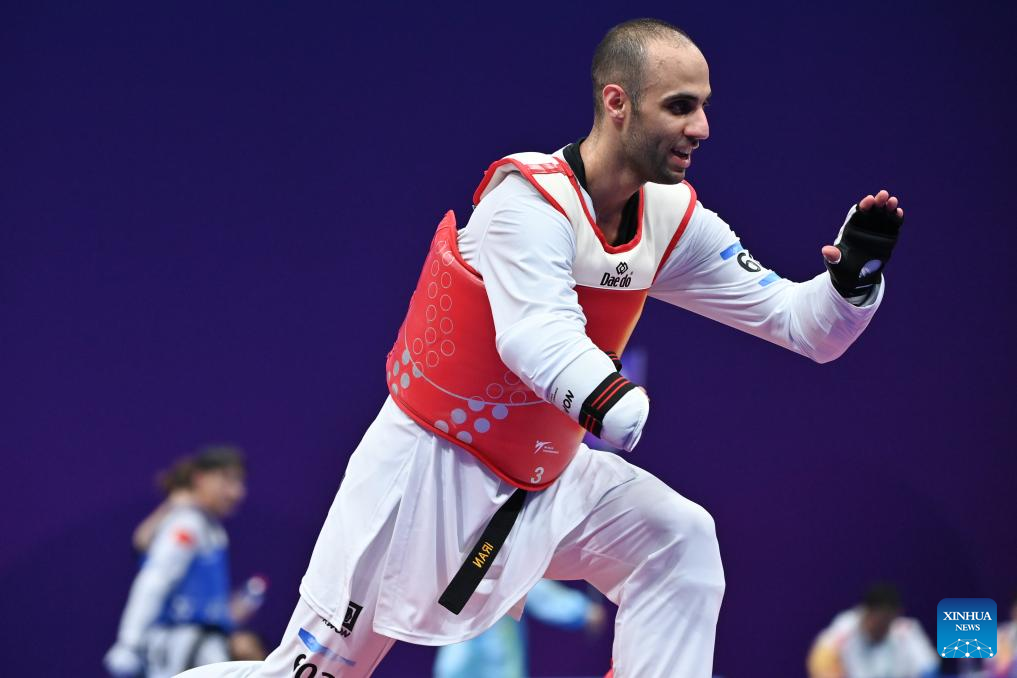 Iran's Mahdi Pourrahnamaahmadgourabi (C) competes against China's Chen Shihe during their Men's K44 70KG Gold Medal Contest of Taekwondo at the 4th Asian Para Games in Hangzhou, east China's Zhejiang Province, Oct. 24, 2023. (Xinhua/Huang Zongzhi)