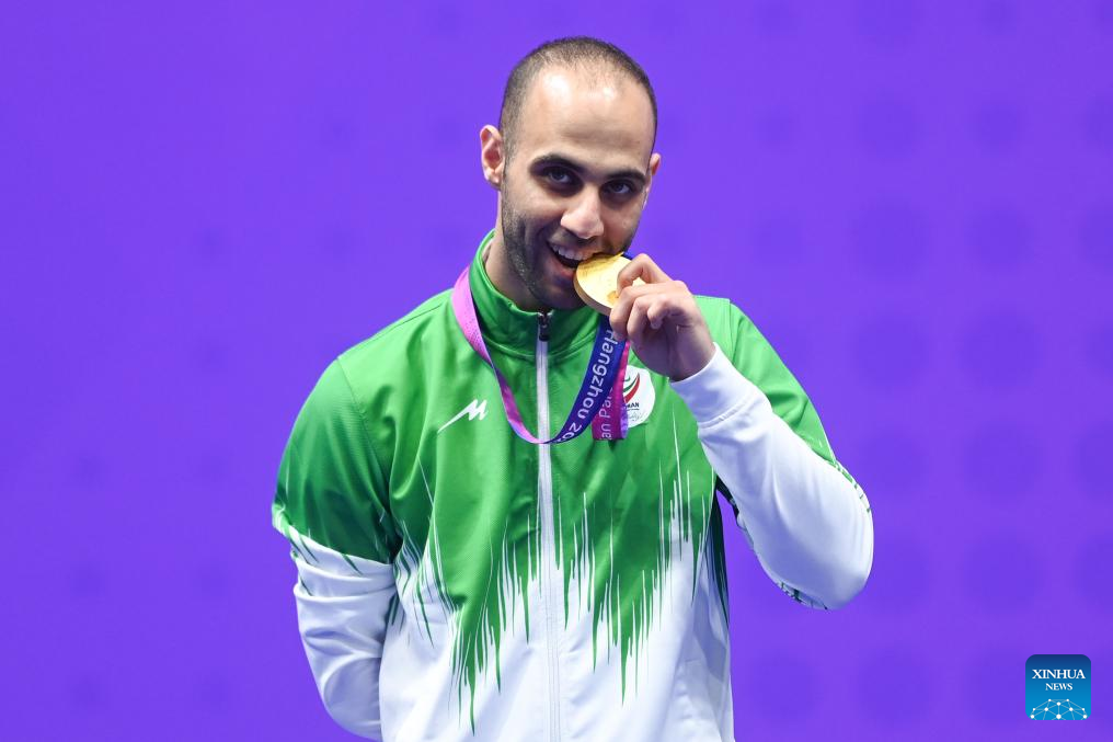 Gold medalist Iran's Mahdi Pourrahnamaahmadgourabi poses for photos during the awarding ceremony of the Men's K44 70KG event of Taekwondo at the 4th Asian Para Games in Hangzhou, east China's Zhejiang Province, Oct. 24, 2023. (Xinhua/Huang Zongzhi)