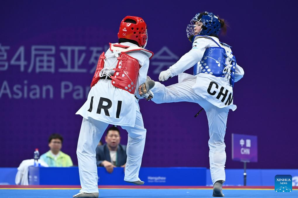 China's Yao Yinan (R) competes against Iran's Romina Chamsouraki during their Women's K44 65KG Gold Medal Contest of Taekwondo at the 4th Asian Para Games in Hangzhou, east China's Zhejiang Province, Oct. 24, 2023. (Xinhua/Huang Zongzhi)