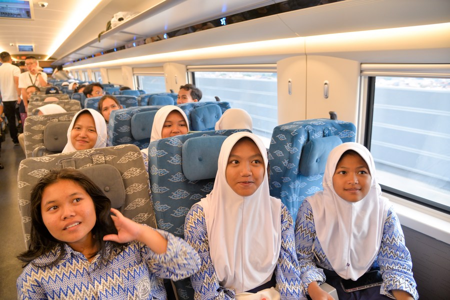 Students attend a free class given by Jakarta-Bandung High-Speed Railway (HSR) Electric Multiple Unit (EMU) Educational and Cultural Exchange Base in the carriage of a running Jakarta-Bandung HSR EMU train in Indonesia, Oct. 24, 2023. (Xinhua/Xu Qin)