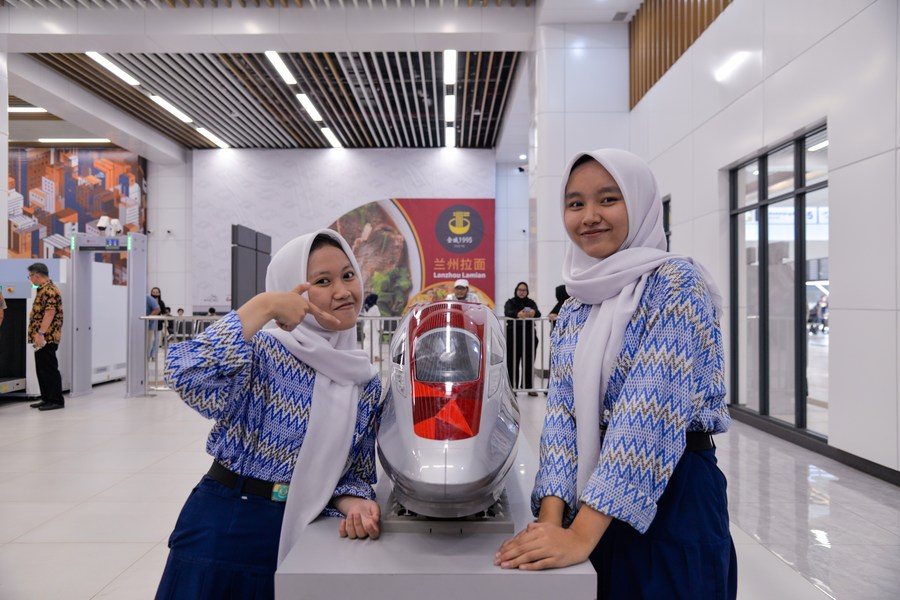 Two students from Ngamprah No.3 Junior High School pose for photos with a model of Jakarta-Bandung High-Speed Railway (HSR) Electric Multiple Unit (EMU) train in Halim Station in Jakarta, Indonesia, Oct. 24, 2023. (Xinhua/Xu Qin)